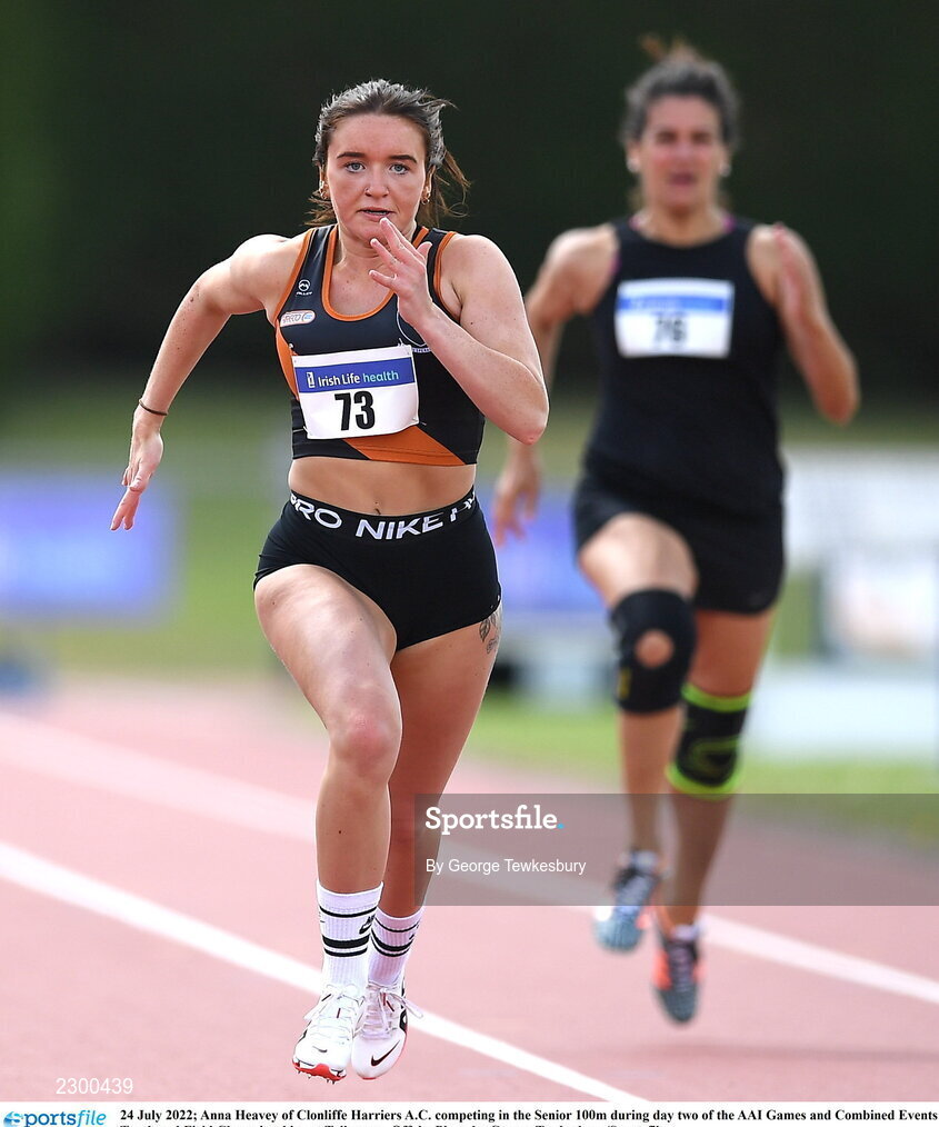 24 July 2022; Anna Heavey of Clonliffe Harriers A.C. competing in the Senior 100m during day two of the AAI Games and Combined Events Track and Field Championships at Tullamore, Offaly. Photo by George Tewkesbury/Sportsfile