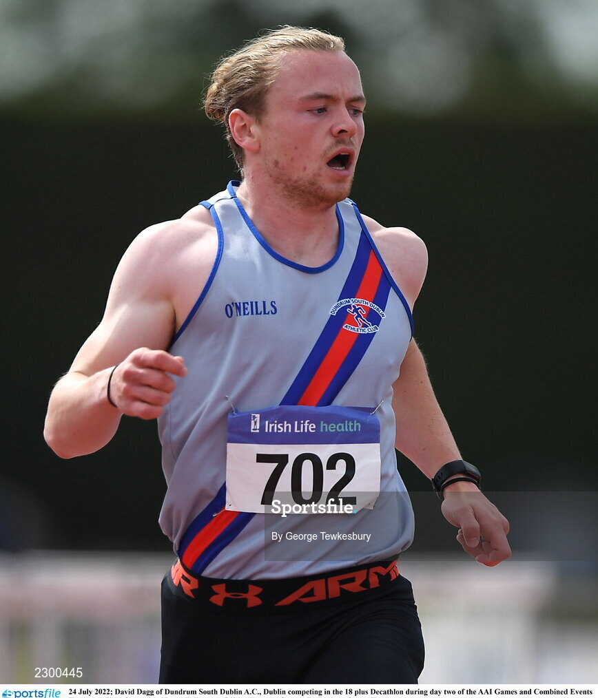 24 July 2022; David Dagg of Dundrum South Dublin A.C., Dublin competing in the 18 plus Decathlon during day two of the AAI Games and Combined Events Track and Field Championships at Tullamore, Offaly. Photo by George Tewkesbury/Sportsfile