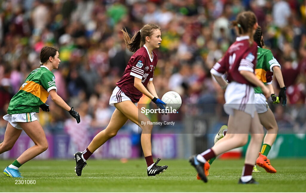 24 July 2022; Lola Matthews, Killinkere N.S., Virginia, Cavan, representing Galway, during the INTO Cumann na mBunscol GAA Respect Exhibition Go Games at GAA All-Ireland Senior Football Championship Final match between Kerry and Galway at Croke Park in Dublin. Photo by Ramsey Cardy/Sportsfile