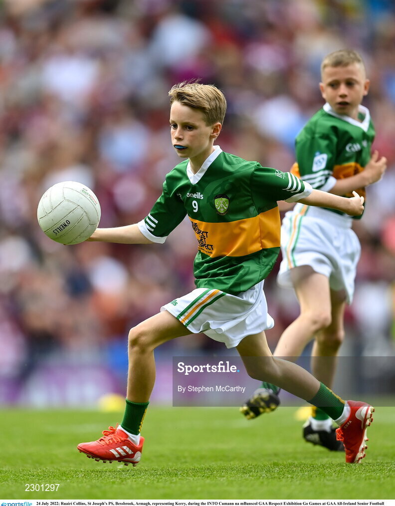 24 July 2022; Ruairí Collins, St Joseph’s PS, Bessbrook, Armagh, representing Kerry, during the INTO Cumann na mBunscol GAA Respect Exhibition Go Games at GAA All-Ireland Senior Football Championship Final match between Kerry and Galway at Croke Park in Dublin. Photo by Stephen McCarthy/Sportsfile