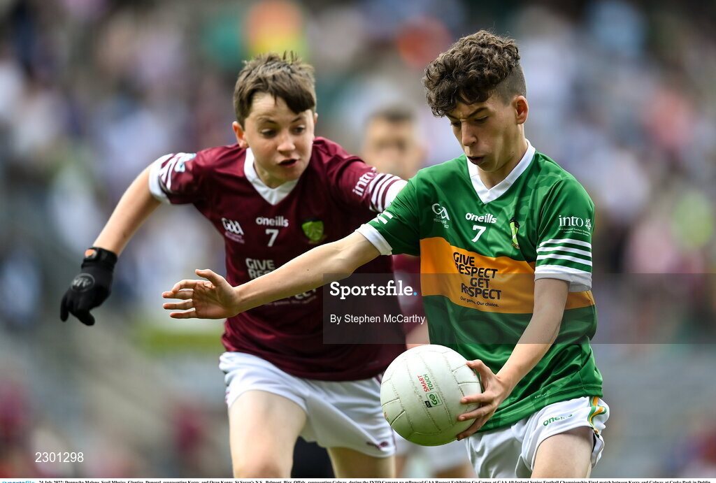 24 July 2022; Donnacha Malone, Scoil Mhuire, Glenties, Donegal, representing Kerry, and Oran Kenny, St Saran's N.S., Belmont, Birr, Offaly, representing Galway, during the INTO Cumann na mBunscol GAA Respect Exhibition Go Games at GAA All-Ireland Senior Football Championship Final match between Kerry and Galway at Croke Park in Dublin. Photo by Stephen McCarthy/Sportsfile