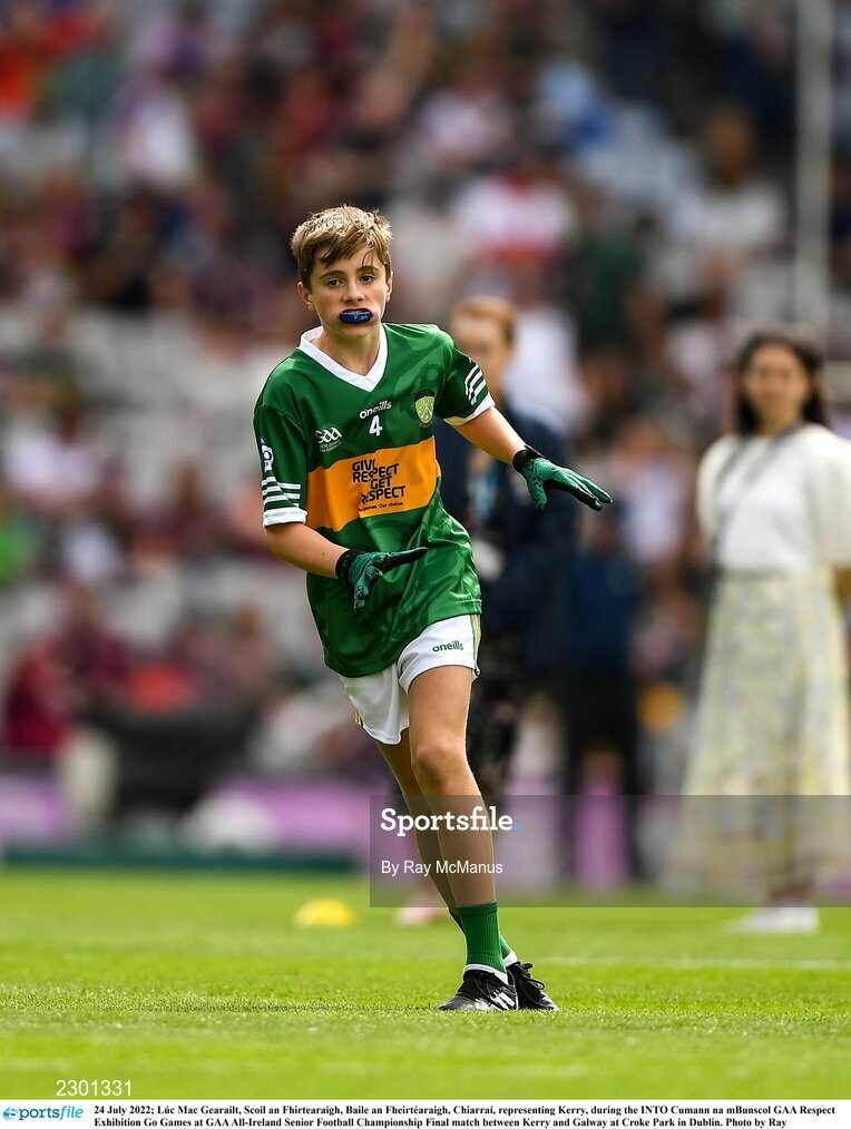 24 July 2022; Lúc Mac Gearailt, Scoil an Fhirtearaigh, Baile an Fheirtéaraigh, Chiarraí, representing Kerry, during the INTO Cumann na mBunscol GAA Respect Exhibition Go Games at GAA All-Ireland Senior Football Championship Final match between Kerry and Galway at Croke Park in Dublin. Photo by Ray McManus/Sportsfile