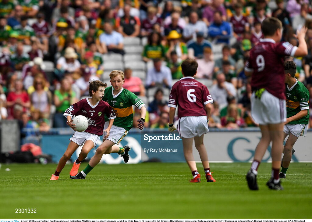 24 July 2022; Josh Furlong, Scoil Naomh Íosaf, Baltinglass, Wicklow, representing Galway, is tackled by Oisín Treacy, St Canices Co Ed, Granges Rd, Kilkenny, representing Galway, during the INTO Cumann na mBunscol GAA Respect Exhibition Go Games at GAA All-Ireland Senior Football Championship Final match between Kerry and Galway at Croke Park in Dublin. Photo by Ray McManus/Sportsfile