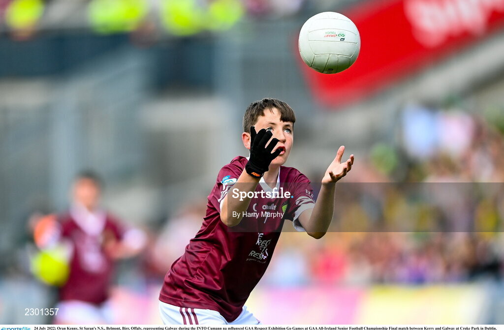 24 July 2022; Oran Kenny, St Saran's N.S., Belmont, Birr, Offaly, representing Galway during the INTO Cumann na mBunscol GAA Respect Exhibition Go Games at GAA All-Ireland Senior Football Championship Final match between Kerry and Galway at Croke Park in Dublin. Photo by Harry Murphy/Sportsfile