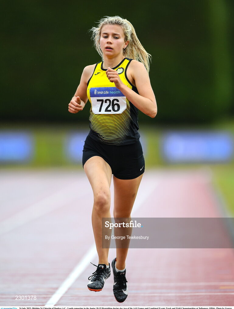 24 July 2022; Bláithín Ní Chiaráin of Dunleer A.C., Louth competing in the Junior 18-19 Heptathlon during day two of the AAI Games and Combined Events Track and Field Championships at Tullamore, Offaly. Photo by George Tewkesbury/Sportsfile