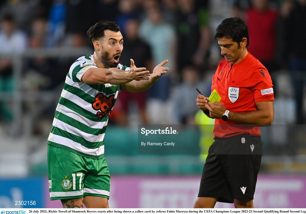 26 July 2022; Richie Towell of Shamrock Rovers reacts after being shown a yellow card by referee Fabio Maresca during the UEFA Champions League 2022-23 Second Qualifying Round Second Leg match between Shamrock Rovers and Ludogorets at Tallaght Stadium in Dublin. Photo by Ramsey Cardy/Sportsfile