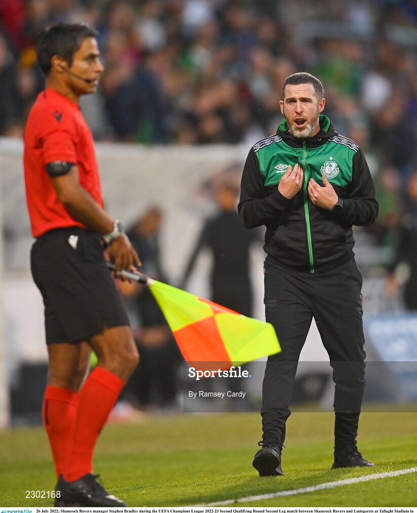 26 July 2022; Shamrock Rovers manager Stephen Bradley during the UEFA Champions League 2022-23 Second Qualifying Round Second Leg match between Shamrock Rovers and Ludogorets at Tallaght Stadium in Dublin. Photo by Ramsey Cardy/Sportsfile