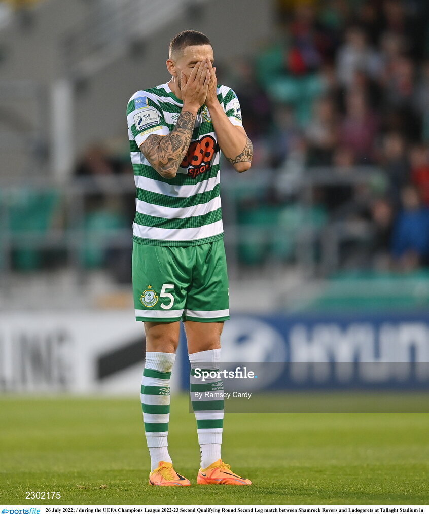 26 July 2022; Lee Grace of Shamrock Rovers reacts after a missed chance during the UEFA Champions League 2022-23 Second Qualifying Round Second Leg match between Shamrock Rovers and Ludogorets at Tallaght Stadium in Dublin. Photo by Ramsey Cardy/Sportsfile