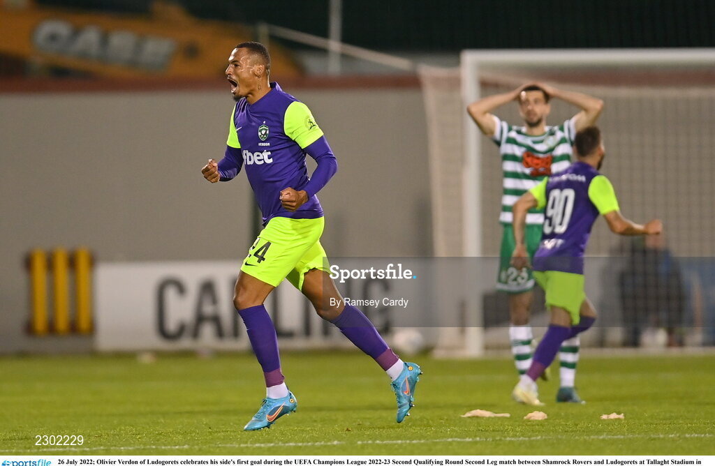 26 July 2022; Olivier Verdon of Ludogorets celebrates his side's first goal during the UEFA Champions League 2022-23 Second Qualifying Round Second Leg match between Shamrock Rovers and Ludogorets at Tallaght Stadium in Dublin. Photo by Ramsey Cardy/Sportsfile