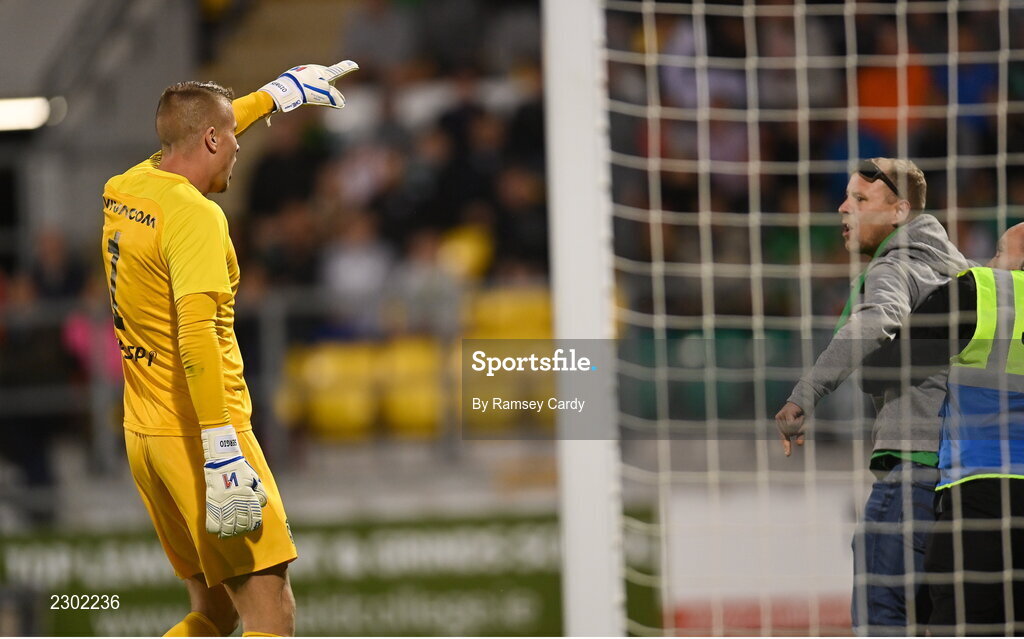 26 July 2022; A pitch invader is restrained from Ludogorets goalkeeper Sergio Padt during the UEFA Champions League 2022-23 Second Qualifying Round Second Leg match between Shamrock Rovers and Ludogorets at Tallaght Stadium in Dublin. Photo by Ramsey Cardy/Sportsfile