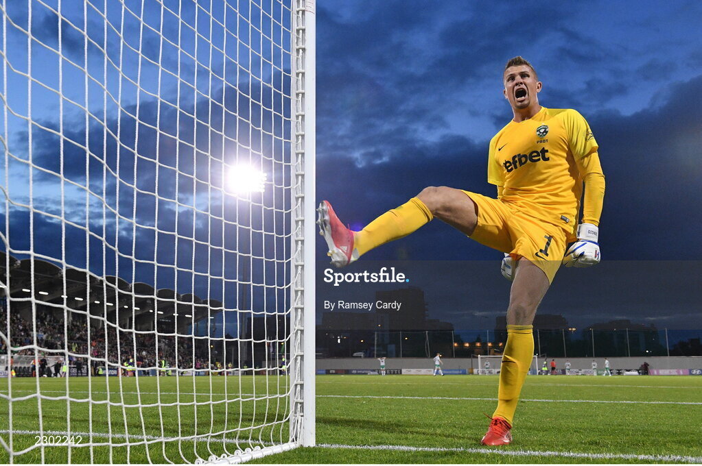 26 July 2022; Ludogorets goalkeeper Sergio Padt celebrates his side's first goal, scored by Cauly Souza, during the UEFA Champions League 2022-23 Second Qualifying Round Second Leg match between Shamrock Rovers and Ludogorets at Tallaght Stadium in Dublin. Photo by Ramsey Cardy/Sportsfile