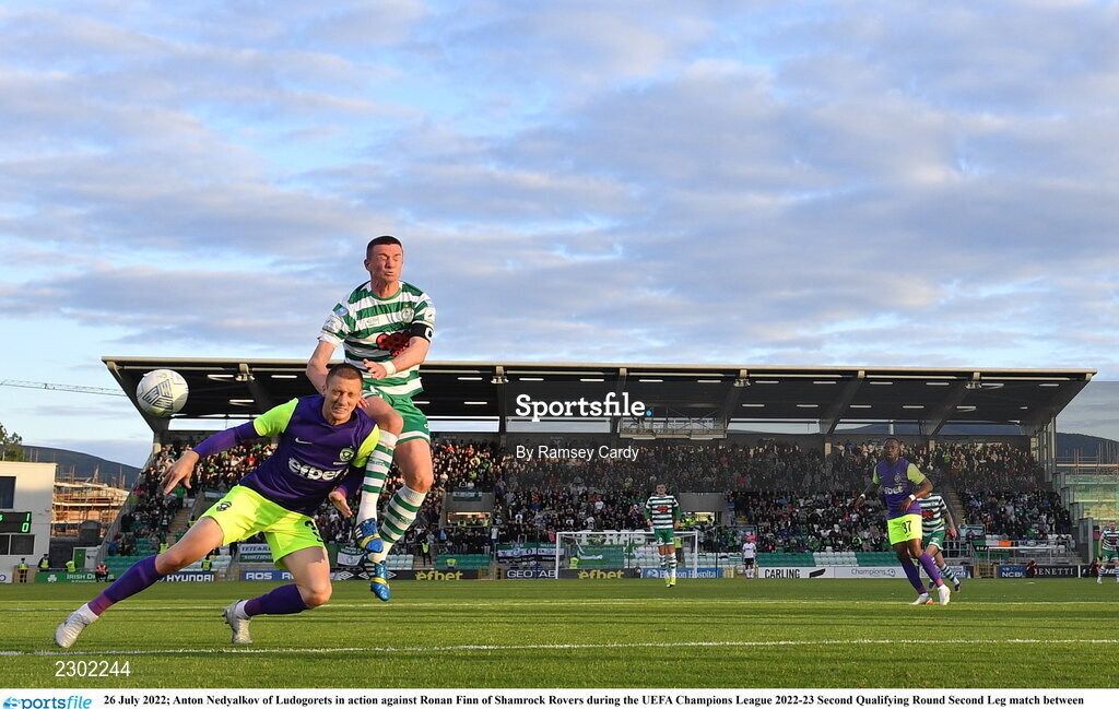 26 July 2022; Anton Nedyalkov of Ludogorets in action against Ronan Finn of Shamrock Rovers during the UEFA Champions League 2022-23 Second Qualifying Round Second Leg match between Shamrock Rovers and Ludogorets at Tallaght Stadium in Dublin. Photo by Ramsey Cardy/Sportsfile
