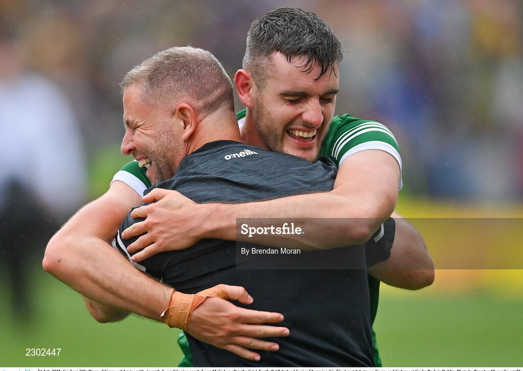 24 July 2022; Graham O'Sullivan of Kerry celebrates with strength & conditioning coach Jason McGahan after the GAA Football All-Ireland Senior Championship Final match between Kerry and Galway at Croke Park in Dublin. Photo by Brendan Moran/Sportsfile