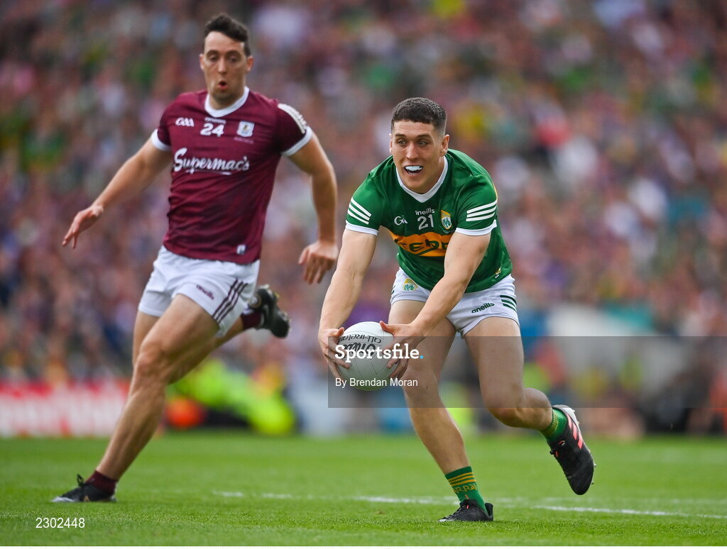 24 July 2022; Joe O'Connor of Kerry in action against Eoin Finnerty of Galway during the GAA Football All-Ireland Senior Championship Final match between Kerry and Galway at Croke Park in Dublin. Photo by Brendan Moran/Sportsfile