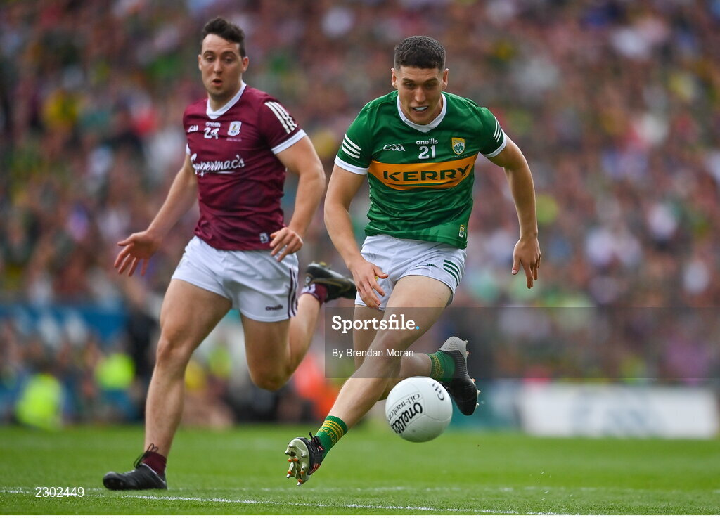 24 July 2022; Joe O'Connor of Kerry in action against Eoin Finnerty of Galway during the GAA Football All-Ireland Senior Championship Final match between Kerry and Galway at Croke Park in Dublin. Photo by Brendan Moran/Sportsfile