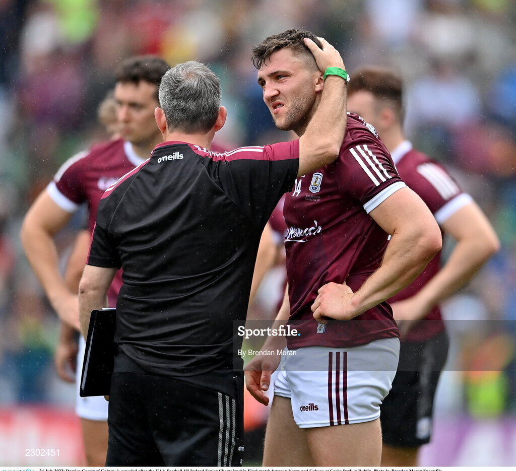 24 July 2022; Damien Comer of Galway is consoled after the GAA Football All-Ireland Senior Championship Final match between Kerry and Galway at Croke Park in Dublin. Photo by Brendan Moran/Sportsfile