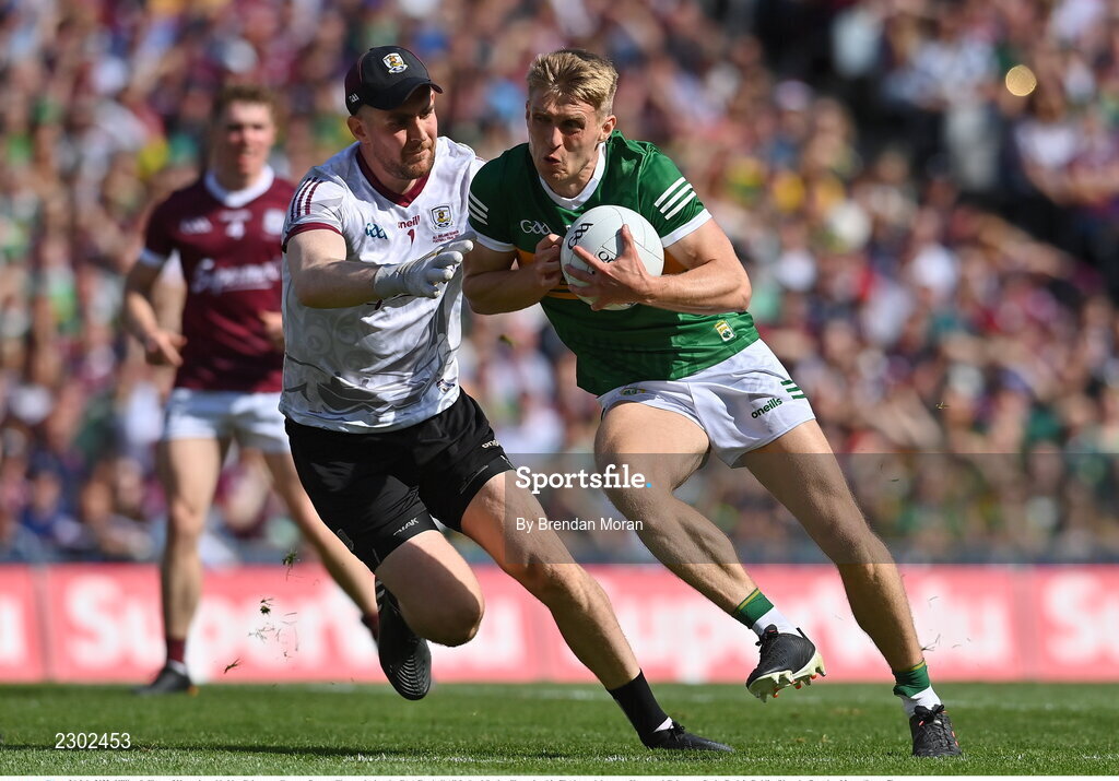 24 July 2022; Killian Spillane of Kerry is tackled by Galway goalkeeper Connor Gleeson during the GAA Football All-Ireland Senior Championship Final match between Kerry and Galway at Croke Park in Dublin. Photo by Brendan Moran/Sportsfile
