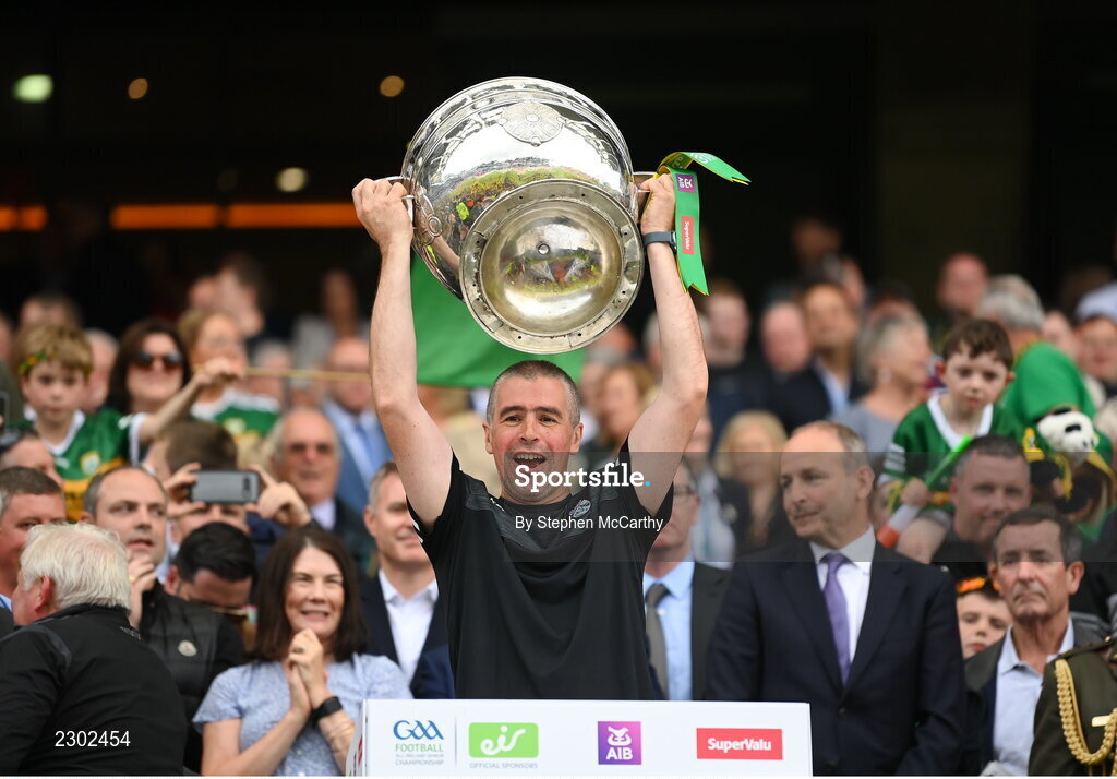 24 July 2022; Kerry logistics manager Brendan Griffin lifts the Sam Maguire Cup after the GAA Football All-Ireland Senior Championship Final match between Kerry and Galway at Croke Park in Dublin. Photo by Stephen McCarthy/Sportsfile