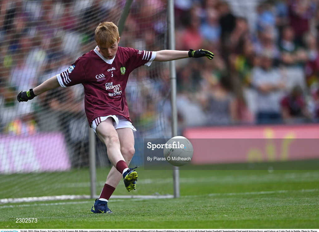 24 July 2022; Oisín Treacy, St Canices Co Ed, Granges Rd, Kilkenny, representing Galway, during the INTO Cumann na mBunscol GAA Respect Exhibition Go Games at GAA All-Ireland Senior Football Championship Final match between Kerry and Galway at Croke Park in Dublin. Photo by Piaras Ó Mídheach/Sportsfile