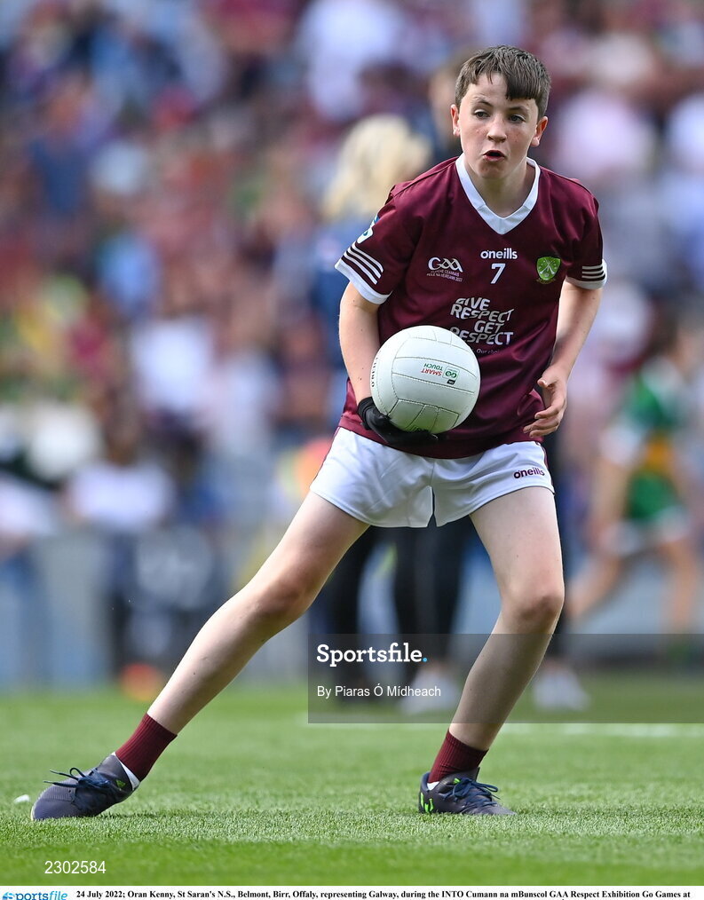 24 July 2022; Oran Kenny, St Saran's N.S., Belmont, Birr, Offaly, representing Galway, during the INTO Cumann na mBunscol GAA Respect Exhibition Go Games at GAA All-Ireland Senior Football Championship Final match between Kerry and Galway at Croke Park in Dublin. Photo by Piaras Ó Mídheach/Sportsfile