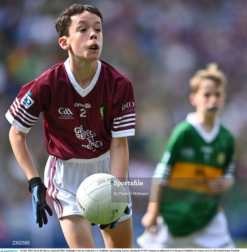 24 July 2022; Devin De Burca, Gaelscoil Mhic Amhlaigh, Cnoc na Cathrach, Co. Gaillimh, representing Galway, during the INTO Cumann na mBunscol GAA Respect Exhibition Go Games at GAA All-Ireland Senior Football Championship Final match between Kerry and Galway at Croke Park in Dublin. Photo by Piaras Ó Mídheach/Sportsfile