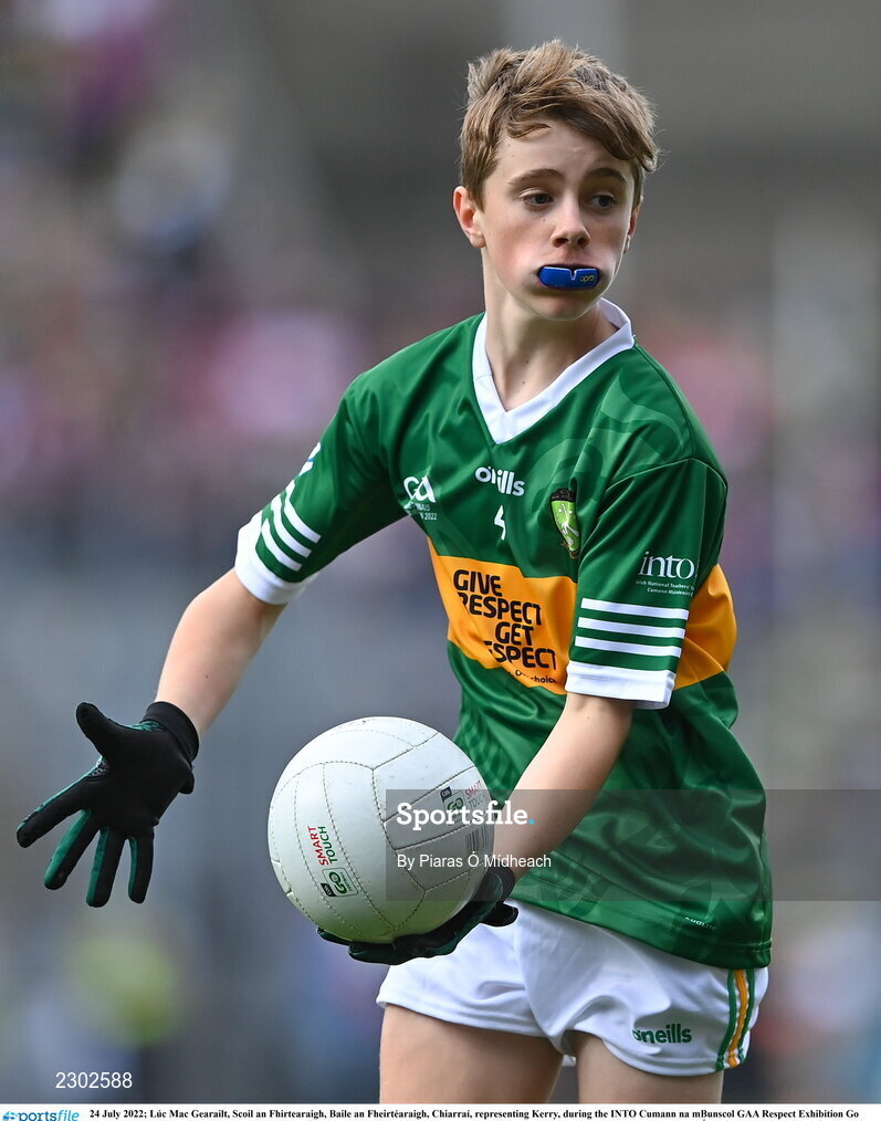 24 July 2022; Lúc Mac Gearailt, Scoil an Fhirtearaigh, Baile an Fheirtéaraigh, Chiarraí, representing Kerry, during the INTO Cumann na mBunscol GAA Respect Exhibition Go Games at GAA All-Ireland Senior Football Championship Final match between Kerry and Galway at Croke Park in Dublin. Photo by Piaras Ó Mídheach/Sportsfile