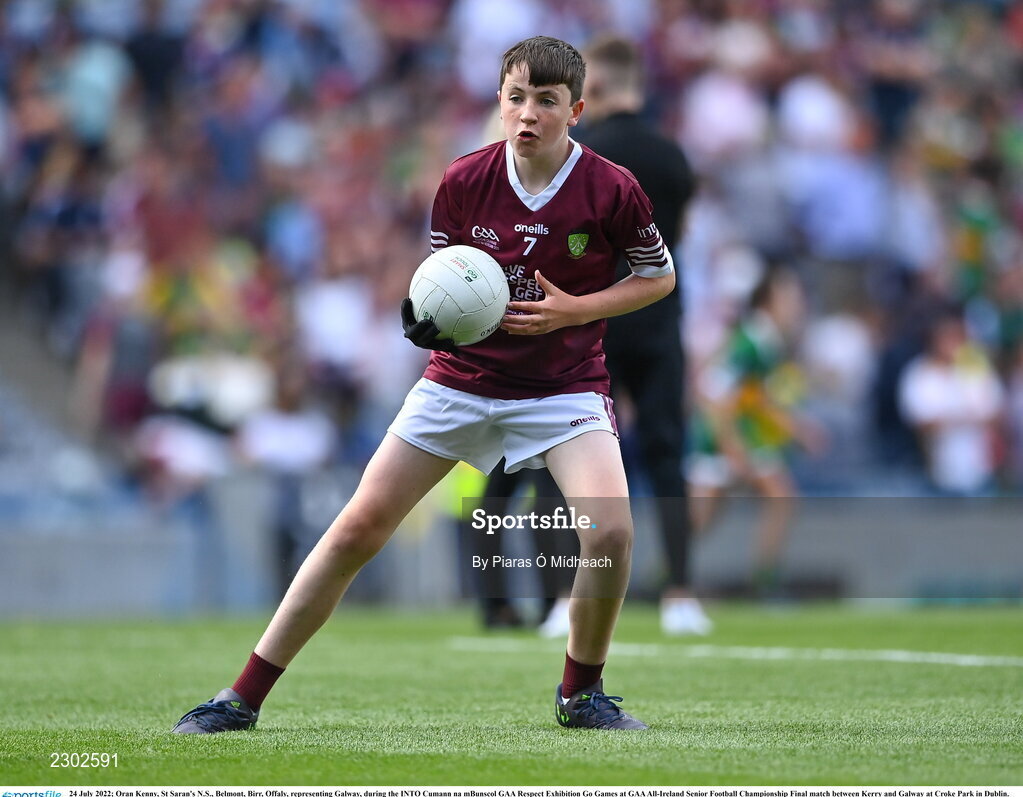 24 July 2022; Oran Kenny, St Saran's N.S., Belmont, Birr, Offaly, representing Galway, during the INTO Cumann na mBunscol GAA Respect Exhibition Go Games at GAA All-Ireland Senior Football Championship Final match between Kerry and Galway at Croke Park in Dublin. Photo by Piaras Ó Mídheach/Sportsfile