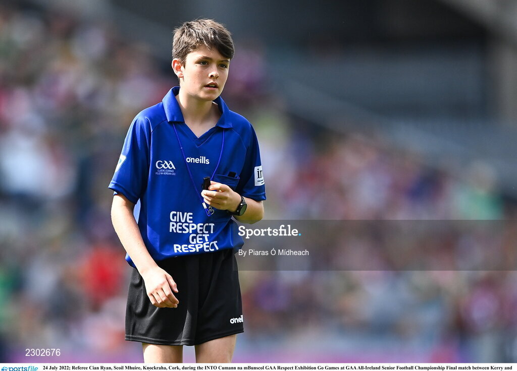 24 July 2022; Referee Cian Ryan, Scoil Mhuire, Knockraha, Cork, during the INTO Cumann na mBunscol GAA Respect Exhibition Go Games at GAA All-Ireland Senior Football Championship Final match between Kerry and Galway at Croke Park in Dublin. Photo by Piaras Ó Mídheach/Sportsfile
