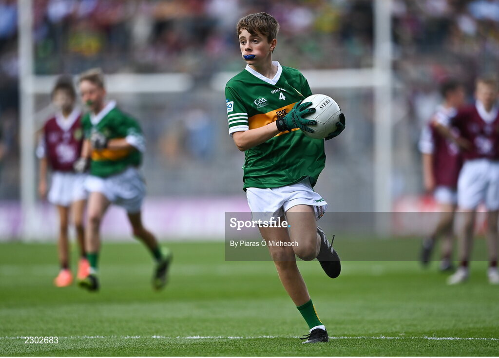 24 July 2022; Lúc Mac Gearailt, Scoil an Fhirtearaigh, Baile an Fheirtéaraigh, Chiarraí, representing Kerry, during the INTO Cumann na mBunscol GAA Respect Exhibition Go Games at GAA All-Ireland Senior Football Championship Final match between Kerry and Galway at Croke Park in Dublin. Photo by Piaras Ó Mídheach/Sportsfile
