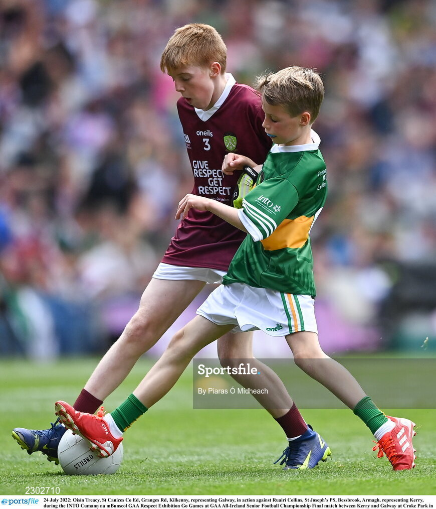 24 July 2022; Oisín Treacy, St Canices Co Ed, Granges Rd, Kilkenny, representing Galway, in action against Ruairí Collins, St Joseph’s PS, Bessbrook, Armagh, representing Kerry, during the INTO Cumann na mBunscol GAA Respect Exhibition Go Games at GAA All-Ireland Senior Football Championship Final match between Kerry and Galway at Croke Park in Dublin. Photo by Piaras Ó Mídheach/Sportsfile