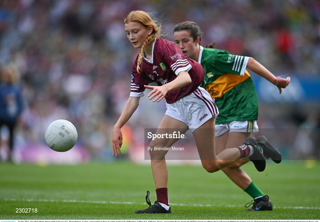 24 July 2022; Aine McCullagh, Queen of the Universe N.S., Bagenalstown, Carlow, representing Galway in action against Lily O’Riordan, Cullina N.S., Killarney, Kerry, representing Kerry during the INTO Cumann na mBunscol GAA Respect Exhibition Go Games at GAA All-Ireland Senior Football Championship Final match between Kerry and Galway at Croke Park in Dublin. Photo by Brendan Moran/Sportsfile