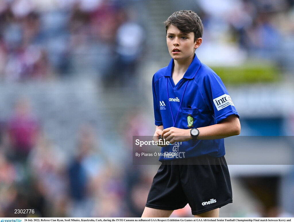 24 July 2022; Referee Cian Ryan, Scoil Mhuire, Knockraha, Cork, during the INTO Cumann na mBunscol GAA Respect Exhibition Go Games at GAA All-Ireland Senior Football Championship Final match between Kerry and Galway at Croke Park in Dublin. Photo by Piaras Ó Mídheach/Sportsfile