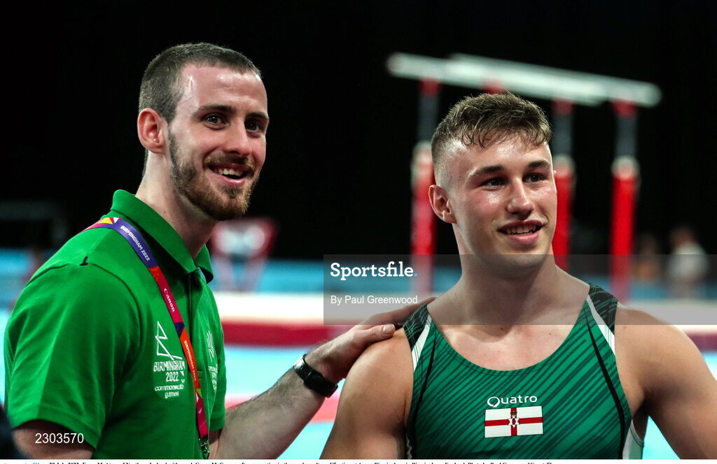 29 July 2022; Ewan McAteer of Northern Ireland with coach Conor McGovern after competing in the men's vault qualification at Arena Birmingham in Birmingham, England. Photo by Paul Greenwood/Sportsfile