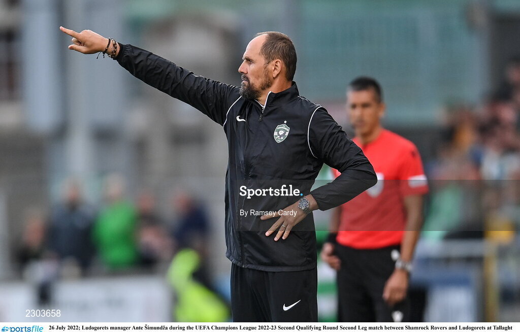 26 July 2022; Ludogorets manager Ante Šimundža during the UEFA Champions League 2022-23 Second Qualifying Round Second Leg match between Shamrock Rovers and Ludogorets at Tallaght Stadium in Dublin. Photo by Ramsey Cardy/Sportsfile