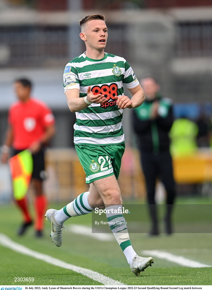 26 July 2022; Andy Lyons of Shamrock Rovers during the UEFA Champions League 2022-23 Second Qualifying Round Second Leg match between Shamrock Rovers and Ludogorets at Tallaght Stadium in Dublin. Photo by Ramsey Cardy/Sportsfile
