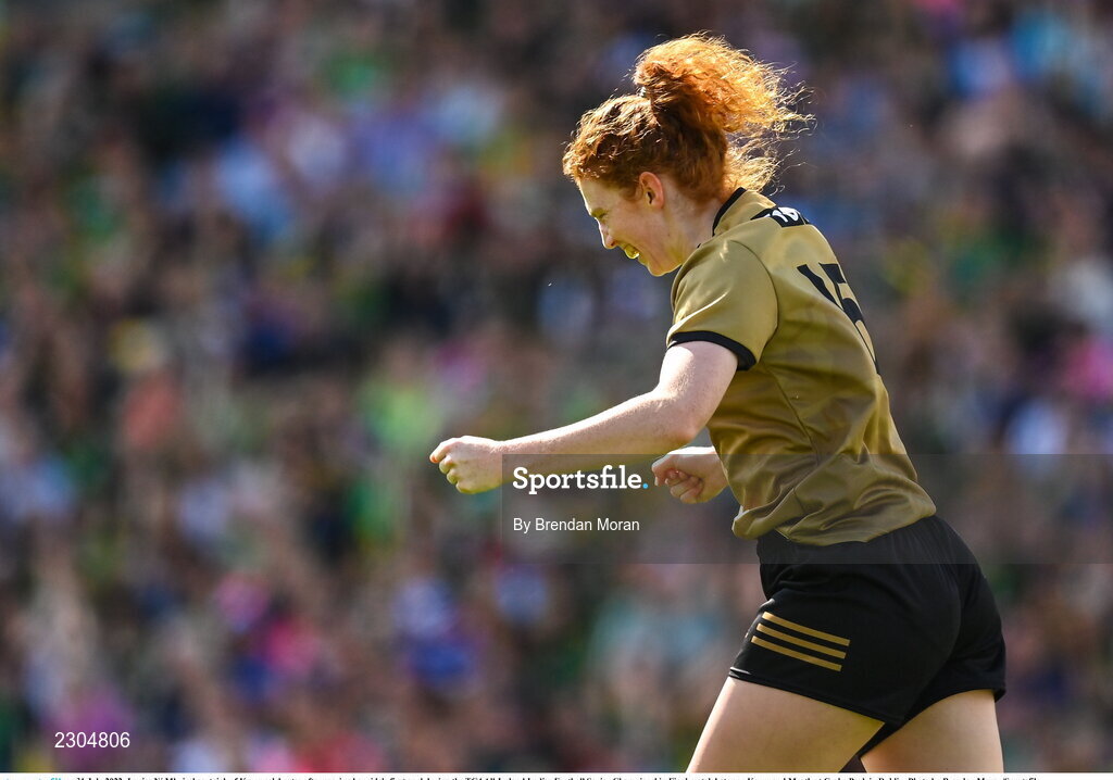31 July 2022; Louise Ní Mhuircheartaigh of Kerry celebrates after scoring her side's first goal during the TG4 All-Ireland Ladies Football Senior Championship Final match between Kerry and Meath at Croke Park in Dublin. Photo by Brendan Moran/Sportsfile