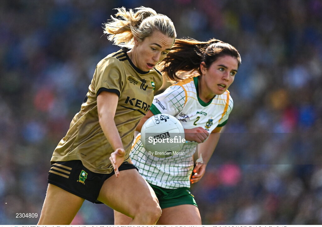 31 July 2022; Niamh Carmody of Kerry in action against Shauna Ennis of Meath during the TG4 All-Ireland Ladies Football Senior Championship Final match between Kerry and Meath at Croke Park in Dublin. Photo by Brendan Moran/Sportsfile