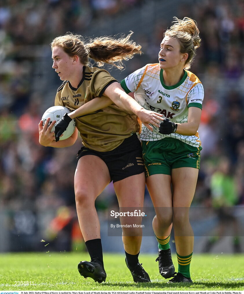 31 July 2022; Síofra O'Shea of Kerry is tackled by Mary Kate Lynch of Meath during the TG4 All-Ireland Ladies Football Senior Championship Final match between Kerry and Meath at Croke Park in Dublin. Photo by Brendan Moran/Sportsfile
