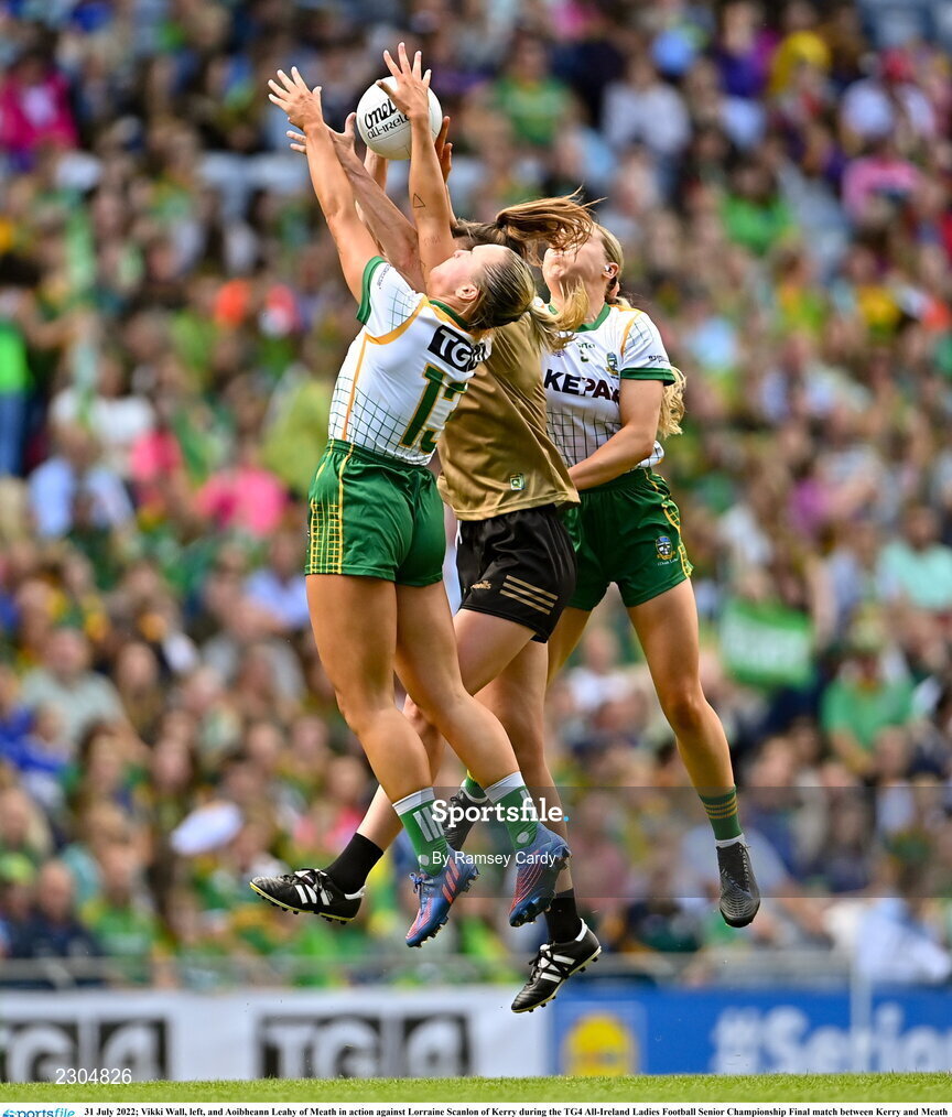 31 July 2022; Vikki Wall, left, and Aoibheann Leahy of Meath in action against Lorraine Scanlon of Kerry during the TG4 All-Ireland Ladies Football Senior Championship Final match between Kerry and Meath at Croke Park in Dublin. Photo by Ramsey Cardy/Sportsfile