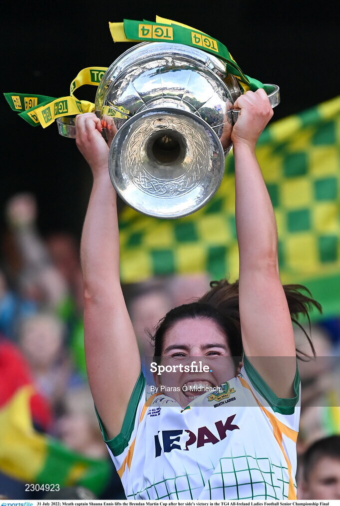 31 July 2022; Meath captain Shauna Ennis lifts the Brendan Martin Cup after her side's victory in the TG4 All-Ireland Ladies Football Senior Championship Final match between Kerry and Meath at Croke Park in Dublin. Photo by Piaras Ó Mídheach/Sportsfile