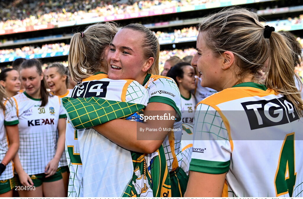 31 July 2022; Vikki Wall of Meath, centre, celebrates with teammate Mary Kate Lynch after their side's victory in the TG4 All-Ireland Ladies Football Senior Championship Final match between Kerry and Meath at Croke Park in Dublin. Photo by Piaras Ó Mídheach/Sportsfile
