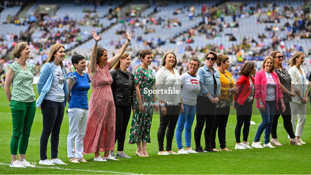 31 July 2022; The Monaghan Jubilee teams from 1997 and 1998 are introduced before the TG4 All-Ireland Ladies Football Championship Finals at Croke Park in Dublin. Photo by Brendan Moran/Sportsfile