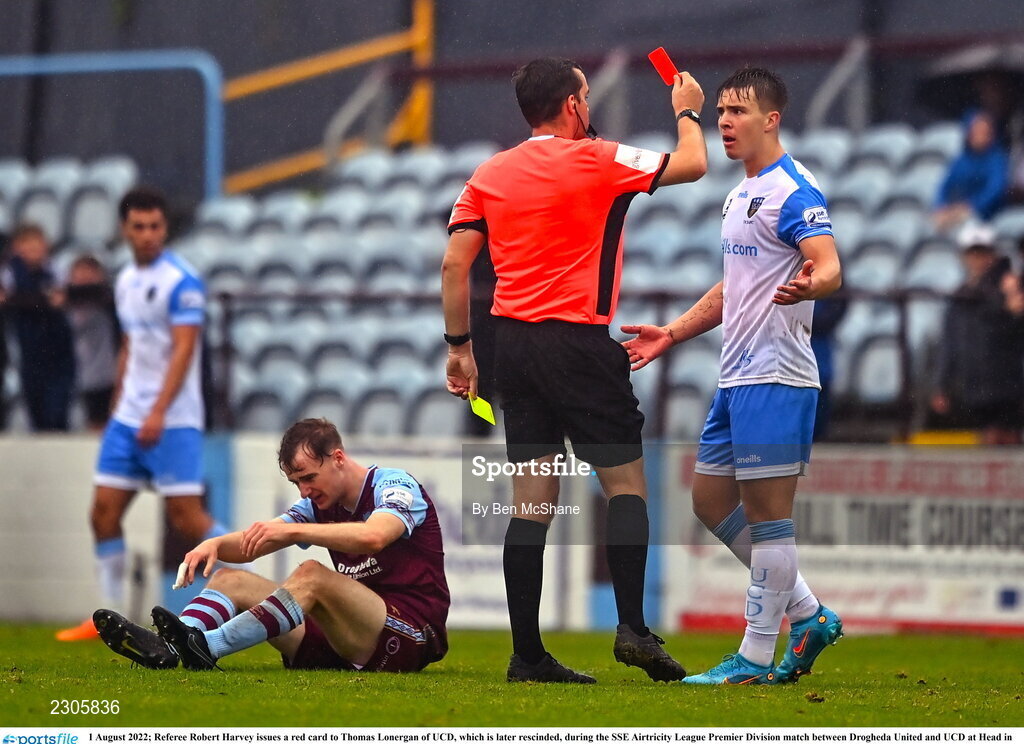 1 August 2022; Referee Robert Harvey issues a red card to Thomas Lonergan of UCD, which is later rescinded, during the SSE Airtricity League Premier Division match between Drogheda United and UCD at Head in the Game Park in Drogheda, Louth. Photo by Ben McShane/Sportsfile