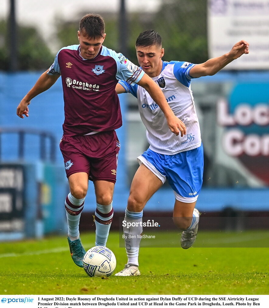 1 August 2022; Dayle Rooney of Drogheda United in action against Dylan Duffy of UCD during the SSE Airtricity League Premier Division match between Drogheda United and UCD at Head in the Game Park in Drogheda, Louth. Photo by Ben McShane/Sportsfile