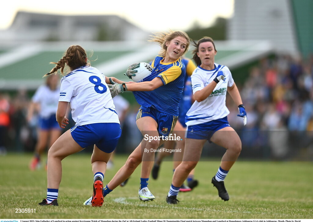 3 August 2022; Sián Gallagher of Longford in action against Kerrieanne Walsh of Monaghan during the ZuCar All-Ireland Ladies Football Minor B Championship Final match between Monaghan and Longford at Donaghmore Ashbourne GAA club in Ashbourne, Meath. Photo by David Fitzgerald/Sportsfile