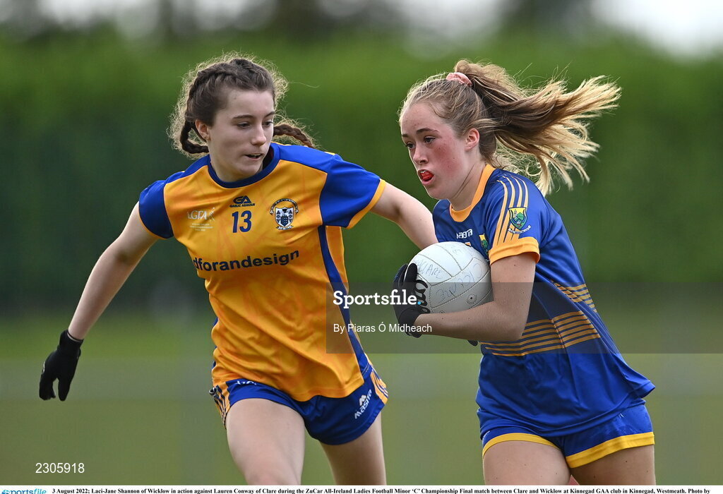 3 August 2022; Laci-Jane Shannon of Wicklow in action against Lauren Conway of Clare during the ZuCar All-Ireland Ladies Football Minor ‘C’ Championship Final match between Clare and Wicklow at Kinnegad GAA club in Kinnegad, Westmeath. Photo by Piaras Ó Mídheach/Sportsfile