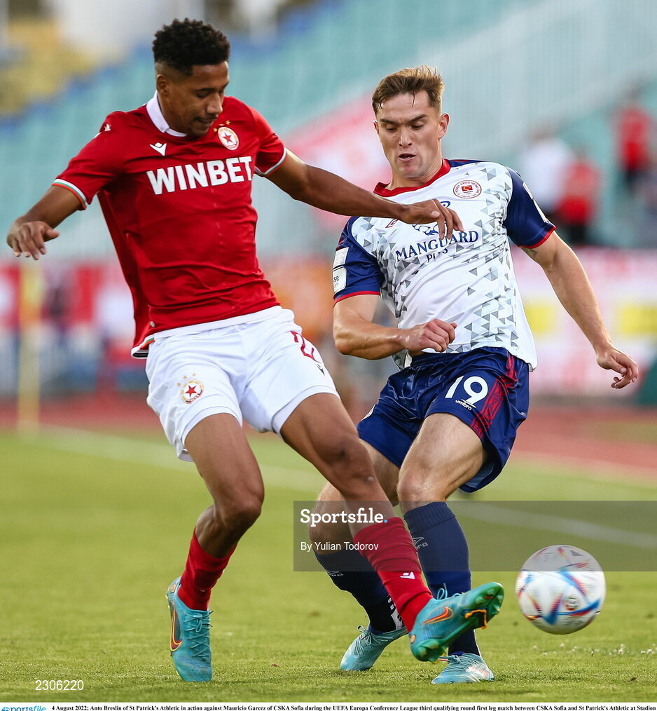 4 August 2022; Anto Breslin of St Patrick's Athletic in action against Mauricio Garcez of CSKA Sofia during the UEFA Europa Conference League third qualifying round first leg match between CSKA Sofia and St Patrick's Athletic at Stadion Balgarska Armia in Sofia, Bulgaria. Photo by Yulian Todorov/Sportsfile