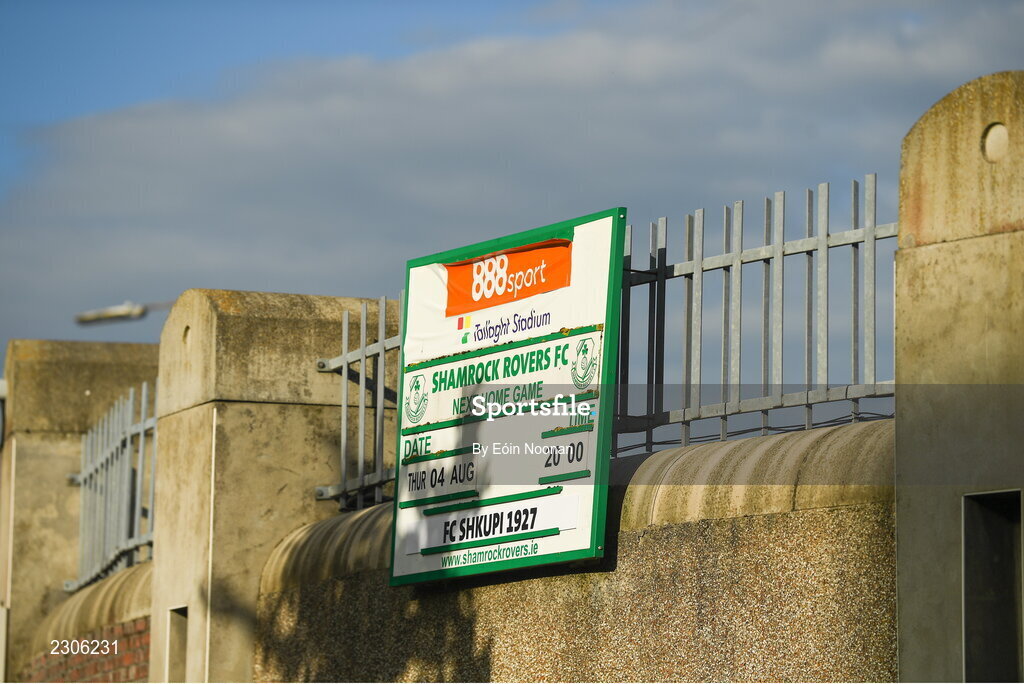 4 August 2022; A view of a sign advertising tonight's game before the UEFA Europa League third qualifying round first leg match between Shamrock Rovers and Shkupi at Tallaght Stadium in Dublin. Photo by Eóin Noonan/Sportsfile