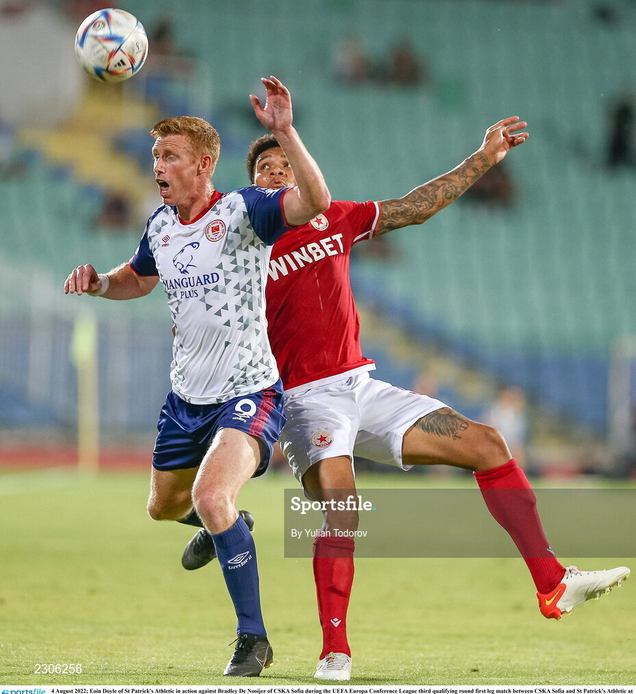 4 August 2022; Eoin Doyle of St Patrick's Athletic in action against Bradley De Nooijer of CSKA Sofia during the UEFA Europa Conference League third qualifying round first leg match between CSKA Sofia and St Patrick's Athletic at Stadion Balgarska Armia in Sofia, Bulgaria. Photo by Yulian Todorov/Sportsfile