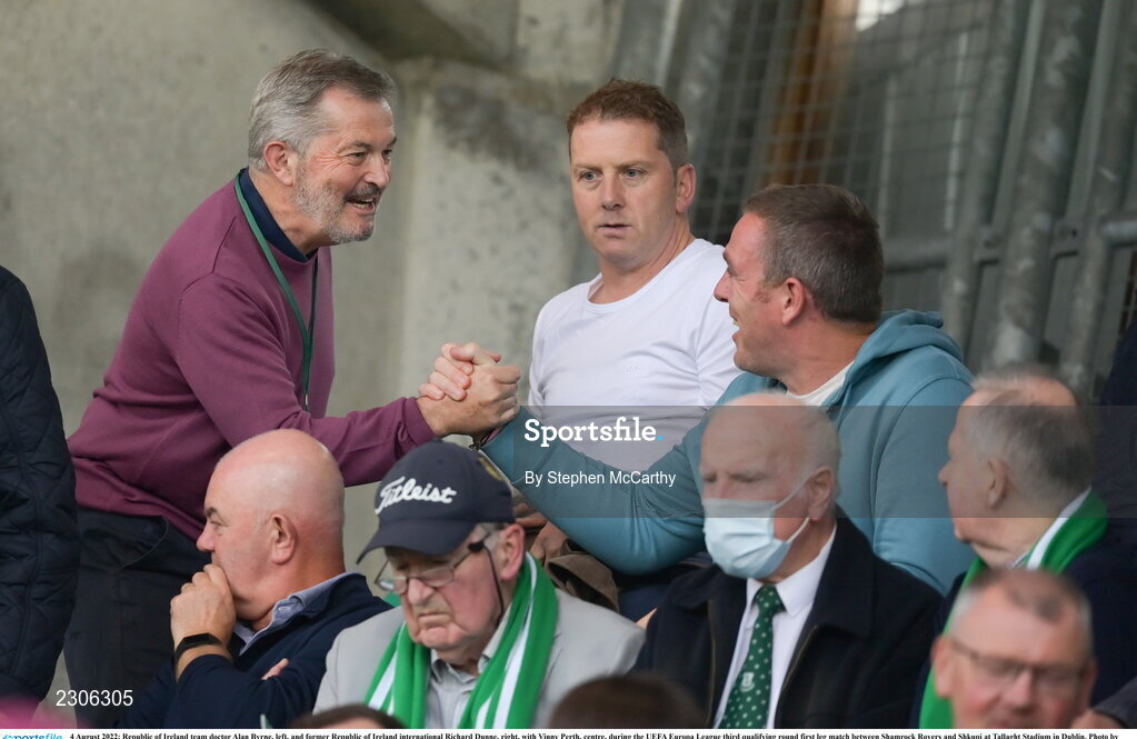 4 August 2022; Republic of Ireland team doctor Alan Byrne, left, and former Republic of Ireland international Richard Dunne, right, with Vinny Perth, centre, during the UEFA Europa League third qualifying round first leg match between Shamrock Rovers and Shkupi at Tallaght Stadium in Dublin. Photo by Stephen McCarthy/Sportsfile